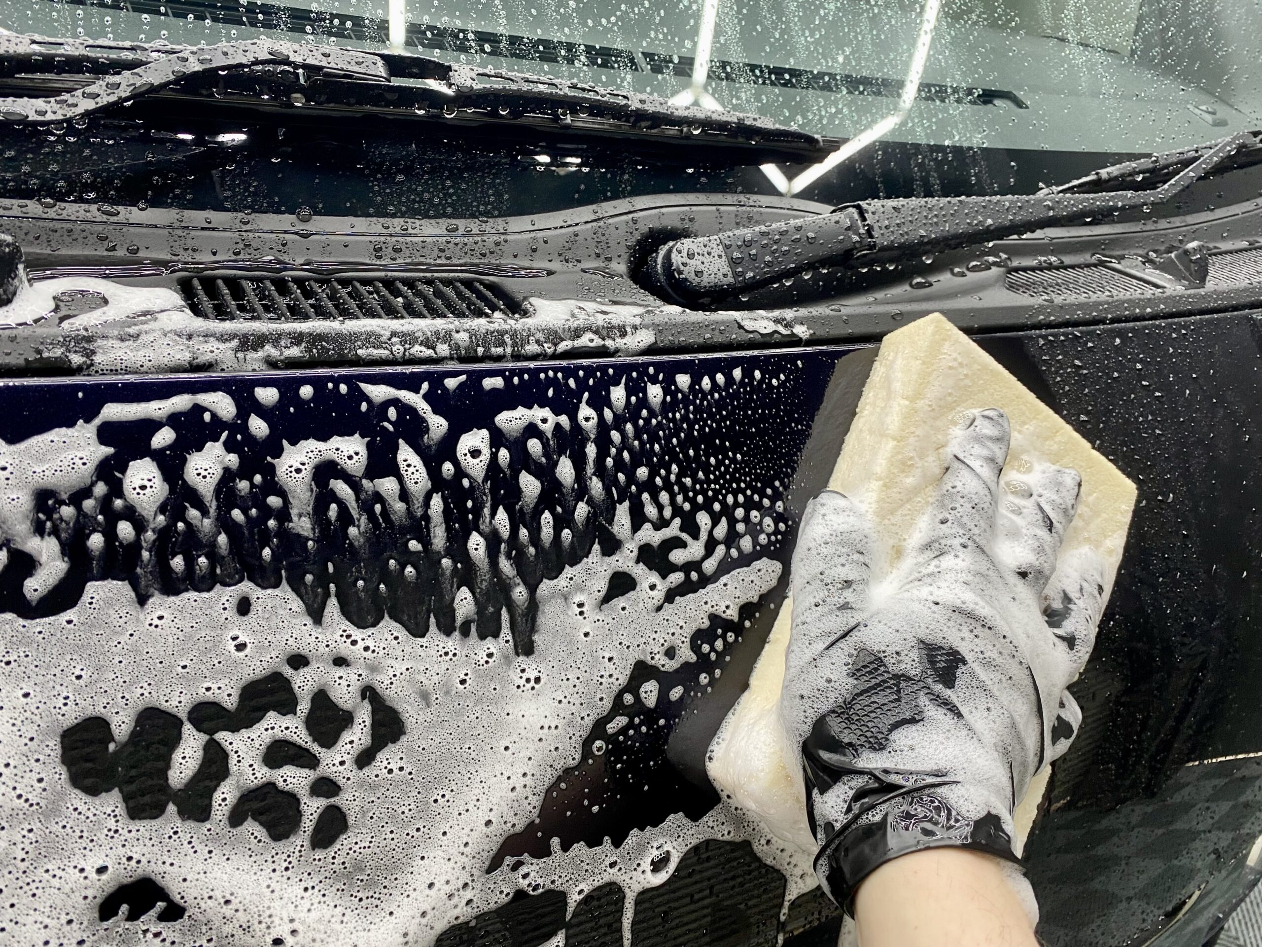 プレウォッシュ後は優しいスポンジにて優しく洗い上げます。